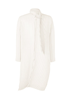 シンプルなパターンに連続した曲線のハンドプリーツを施すことで風がなびく様子を表現したロング丈の長袖シャツ。正面のスリットには、風が通り抜けるようなイメージでタイ部分をくぐらせることが可能です。両サイドにスリットがあります。