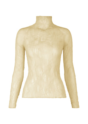 リサイクルポリエステルの生地にプリーツをかけてツイスト加工を施した、透け感が特徴のハイネック長袖トップです。