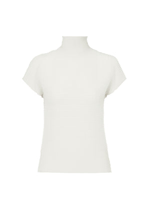 リサイクルポリエステルの生地に縦と横にプリーツ加工を施した、伸縮性のあるハイネックのフレンチスリーブトップです。