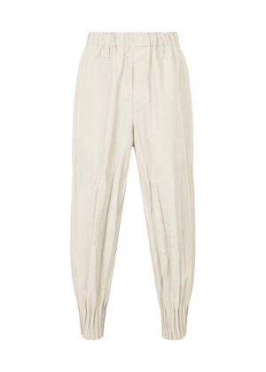 服の両端を手繰り寄せて熱加工を施し、ポリエステルの素材に形を定着させるというアイデアから生まれたシリーズのパンツ。ポリエステルを使用したテキスタイルに部分的な熱加工を施すことで、フォルムを形成しています。シワになりにくく、イージーケアなアイテムです。