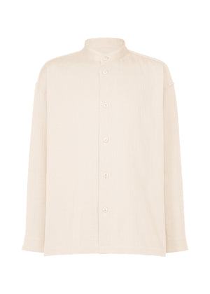 先染めした強撚糸を織り、洗う工程で糸を伸縮させて楊柳の質感に仕上げたスタンドカラーシャツ。ふっくらとした肌触りや風合いが特徴です。