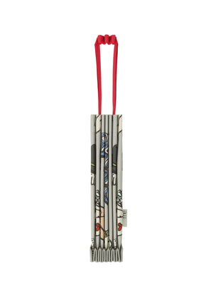 木の幹からインスパイアされた直線的なラインとユニークな持ち手が特徴のミニトートバッグ。手品の道具をモチーフに、マジックペンで描いた柄をプリントしました。
