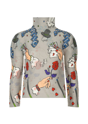 縦と横にプリーツのかかった、伸縮性があるストレッチプリーツのハイネック長袖トップ。手品の道具をモチーフに、マジックペンで描いた柄をプリントしました。