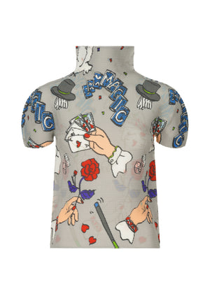 縦と横にプリーツのかかった、伸縮性があるストレッチプリーツのハイネック半袖トップ。手品の道具をモチーフに、マジックペンで描いた柄をプリントしました。
